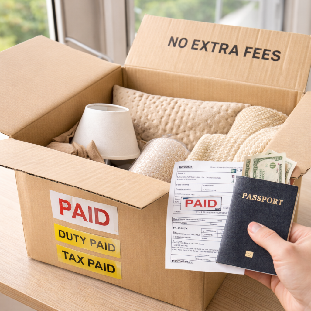 Free shipping with duties and taxes fully paid — no hidden fees on delivery